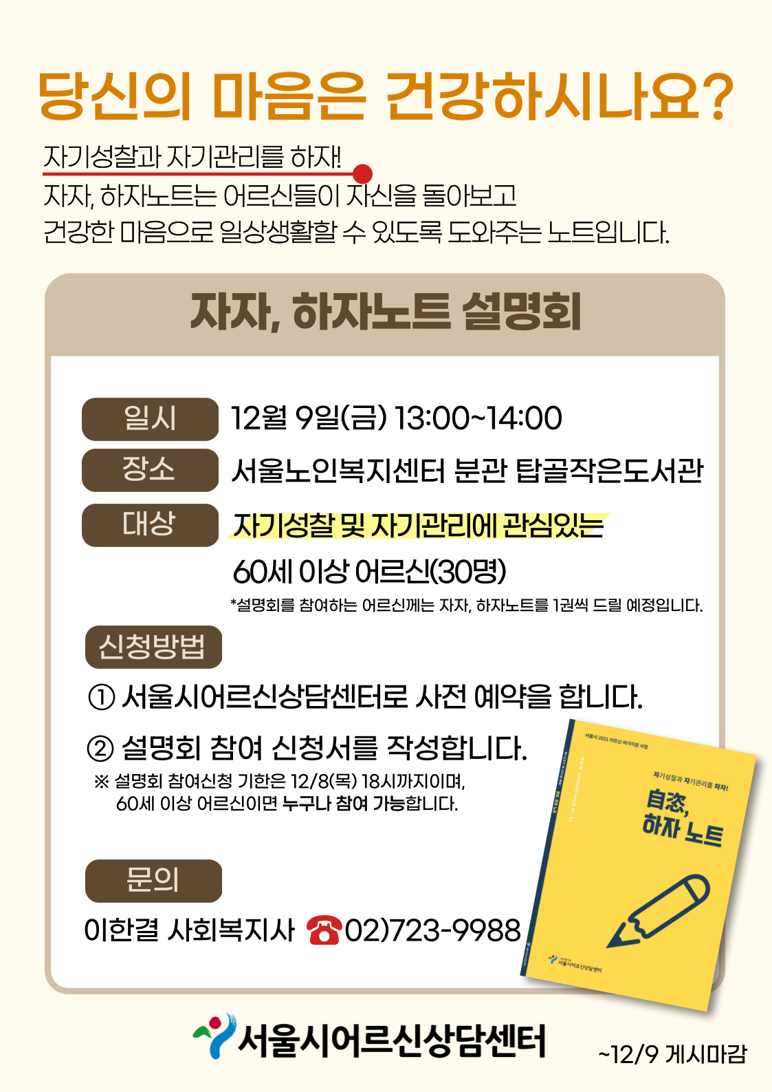 | → | 자자, 하자노트 설명회(3차) 참여자 모집 안내 | 관리자 | 496 | 2022-11-30 | |