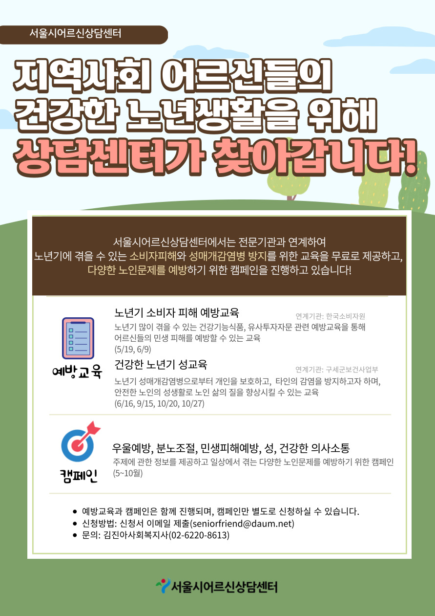 | 152 | [상담교육] 2023 노인집단상담교육: 실제편 참여자 모집 안내 | 관리자 | 941 | 2023-06-02 | |