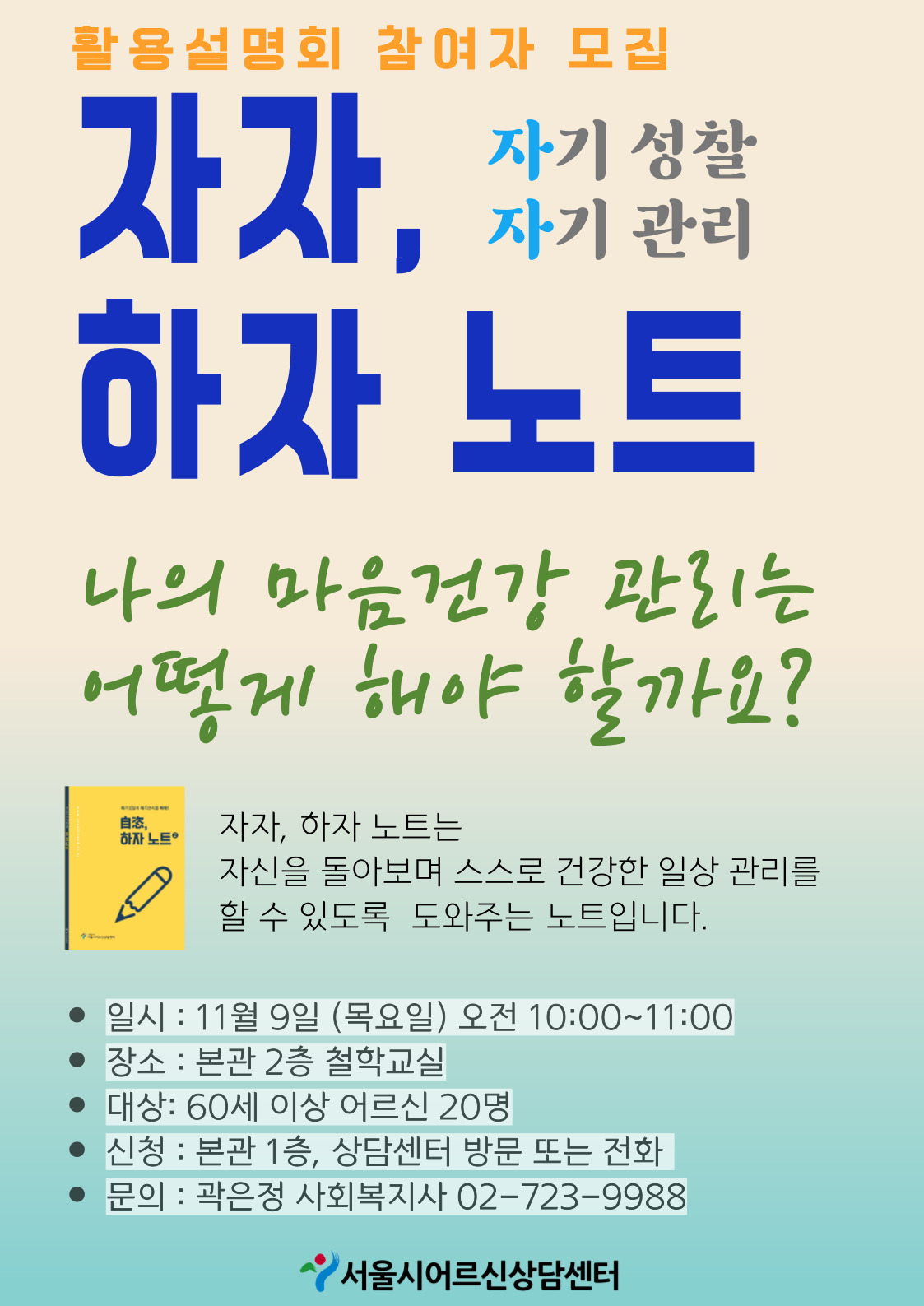 | → | '나의 마음 건강 관리는 어떻게 해야 할까요?'(자자,하자 노트 활용 설명회 참여자 모집) | 관리자 | 643 | 2023-10-25 | |