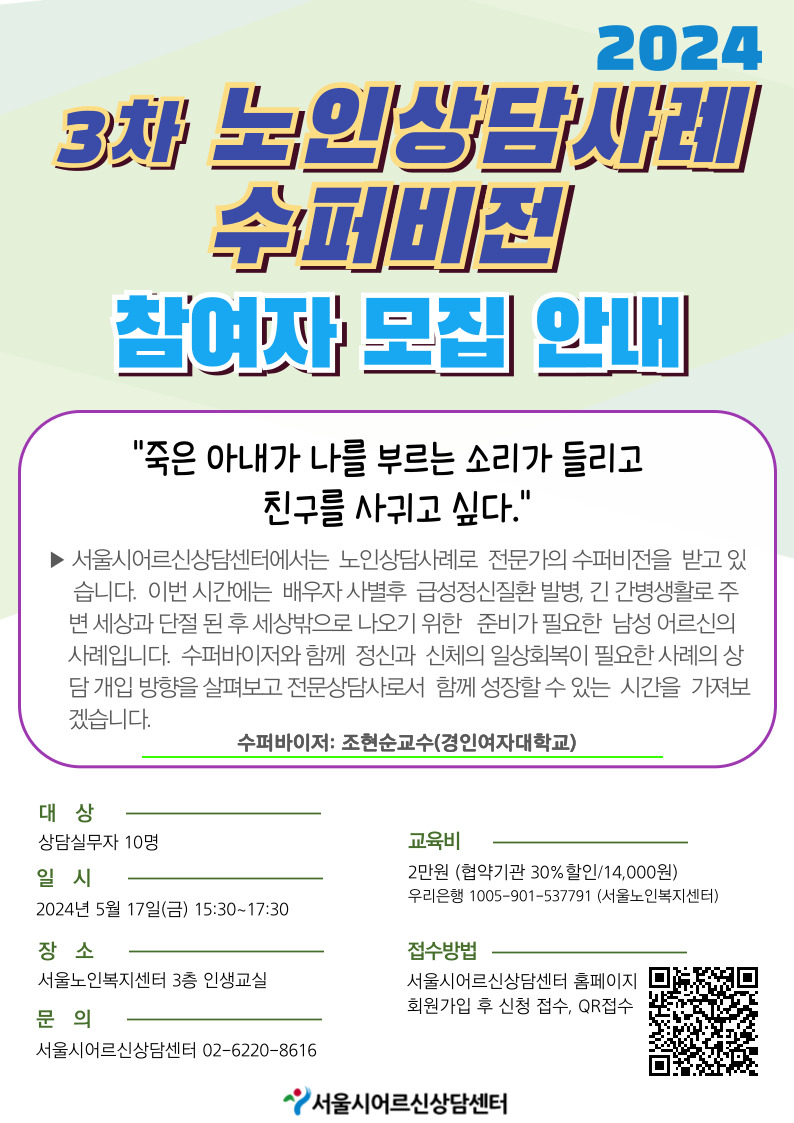 | 170 | 제 2차 상담사례수퍼비전 참여자 모집 안내 | 관리자 | 363 | 2024-03-25 | |