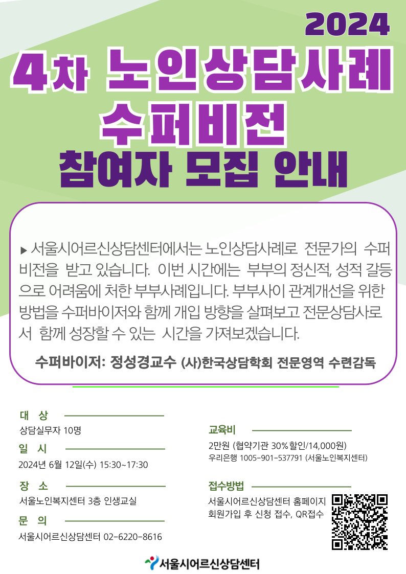 | 177 | [상담교육] 2024년 서울시어르신상담센터 6월 상담교육 참여자 모집 안내 | 관리자 | 821 | 2024-05-14 |