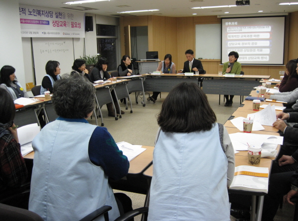 서울시어르신상담센터에서는 노인상담 교육의 중요성과 발전방향에 대해 함께 나눔으로써 노인상담사업 활성화에 기여 하고 전문적인 노인복지 상담의 실천방향에 대해 의견을 나누고자 2010서울시어르신상담센터 정기세미나를 개최하였습니다(2010.12.28)