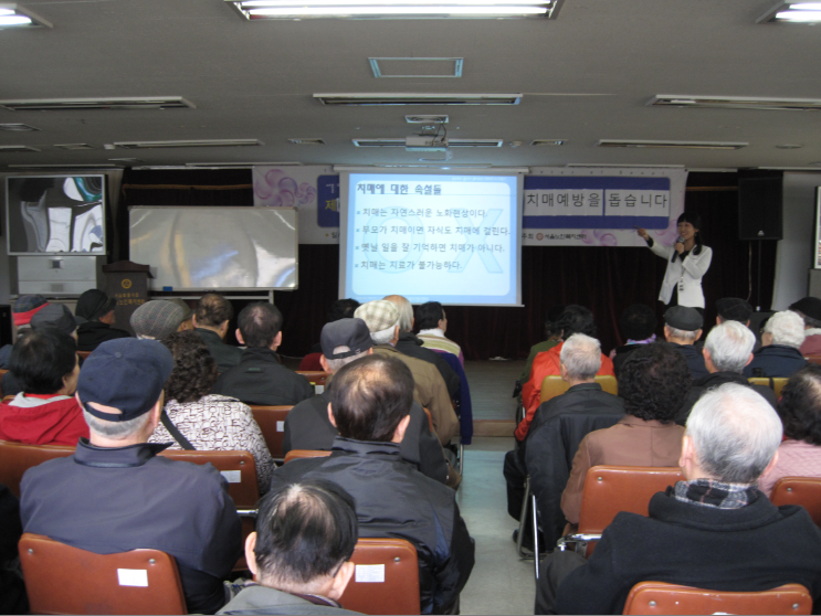 이번 강좌에서는 치매에 대한 속설들, 치매와 건망증의 차이, 치매의 증상과 치료 등에 대한 정보를 제공하였습니다. 또한 치매예방을 위해서는 뇌건강 식생활과 건강수칙 지키기와 같은 생활 속 작은 실천이 중요하다는 점을 소개하였습니다. 오늘 강좌를 들으신 어르신들께서 치매예방의 중요성을 알고 스스로 건강한 생활을 하실 수 있도록 돕는 시간으로 마련되었습니다.