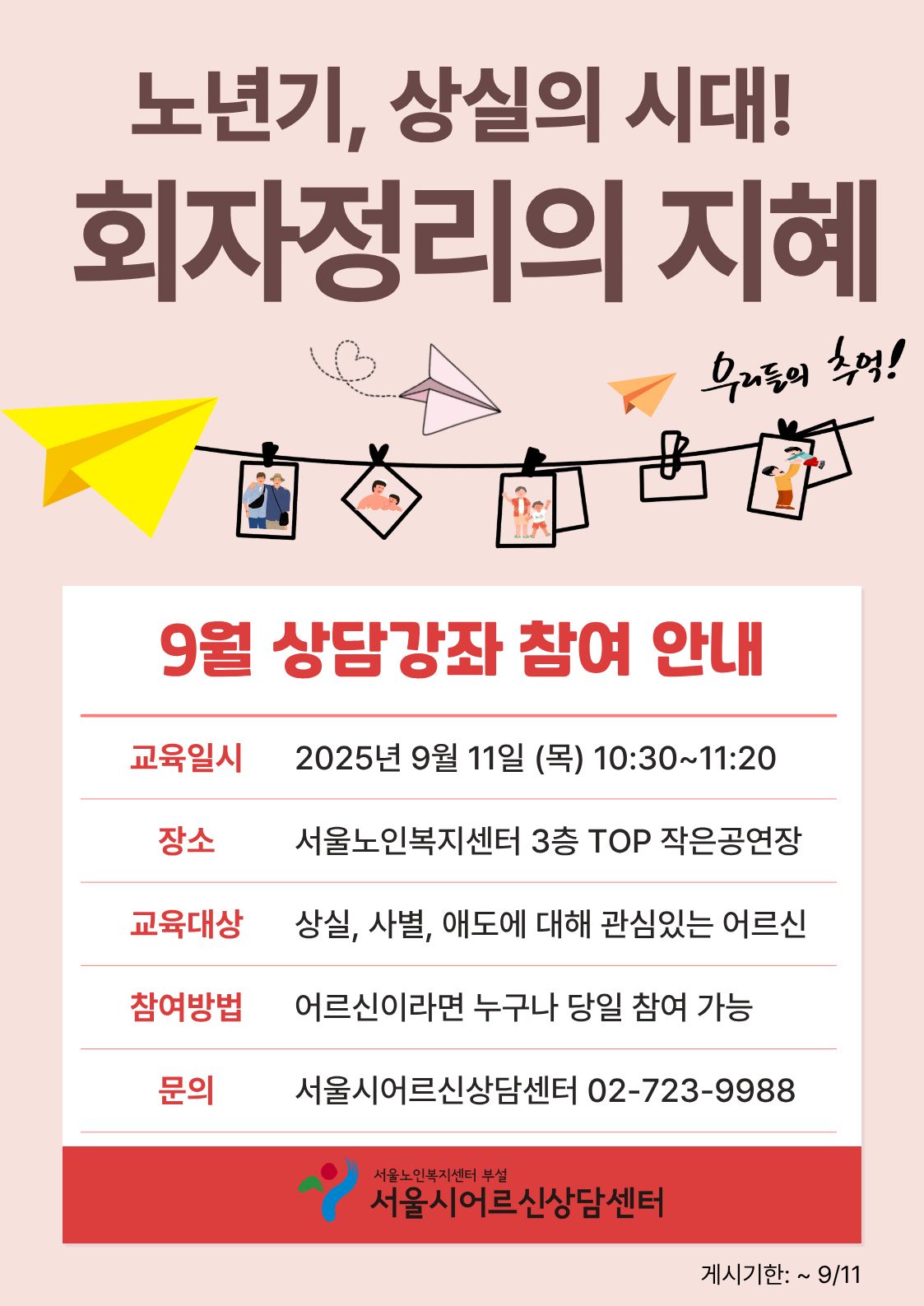 | → | [9월 상담강좌: 노년기 상실의 시대! 회자정리의 지혜] 상담강좌 참여 안내 | 관리자 | 374 | 2025-09-02 | |