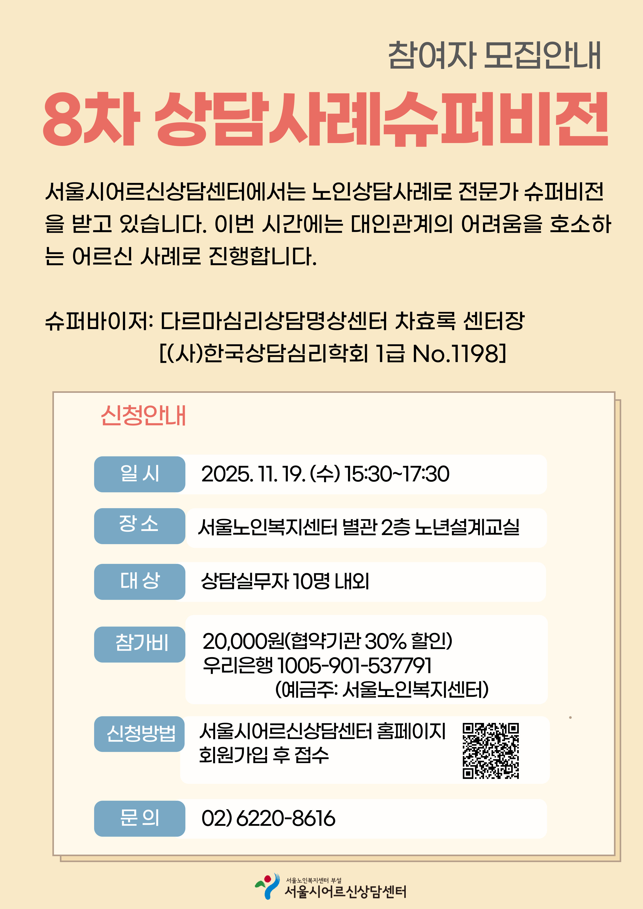 | [공지] | 서울시어르신상담센터 노년설계상담 홍보 영상 | 관리자 | 392 | 2025-12-12 | |